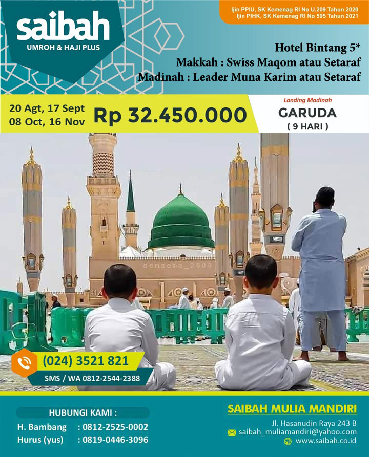 Saibah memiliki jadwal keberangkatan InsyaAllah minimal 4X dalam sebulan dengan berbagai ragam Fasilitas. Didampingi dari Indonesia dan ditanah Suci dibimbing Muthowif yang berpengalaman dan Ramah.
